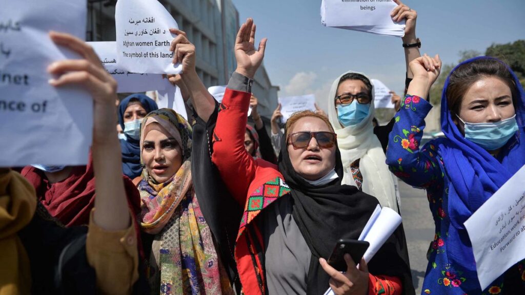 “We want to live as human beings, not as some animal held captive in a corner of a house,” protester Saira Sama Alimyar said at the rally.
