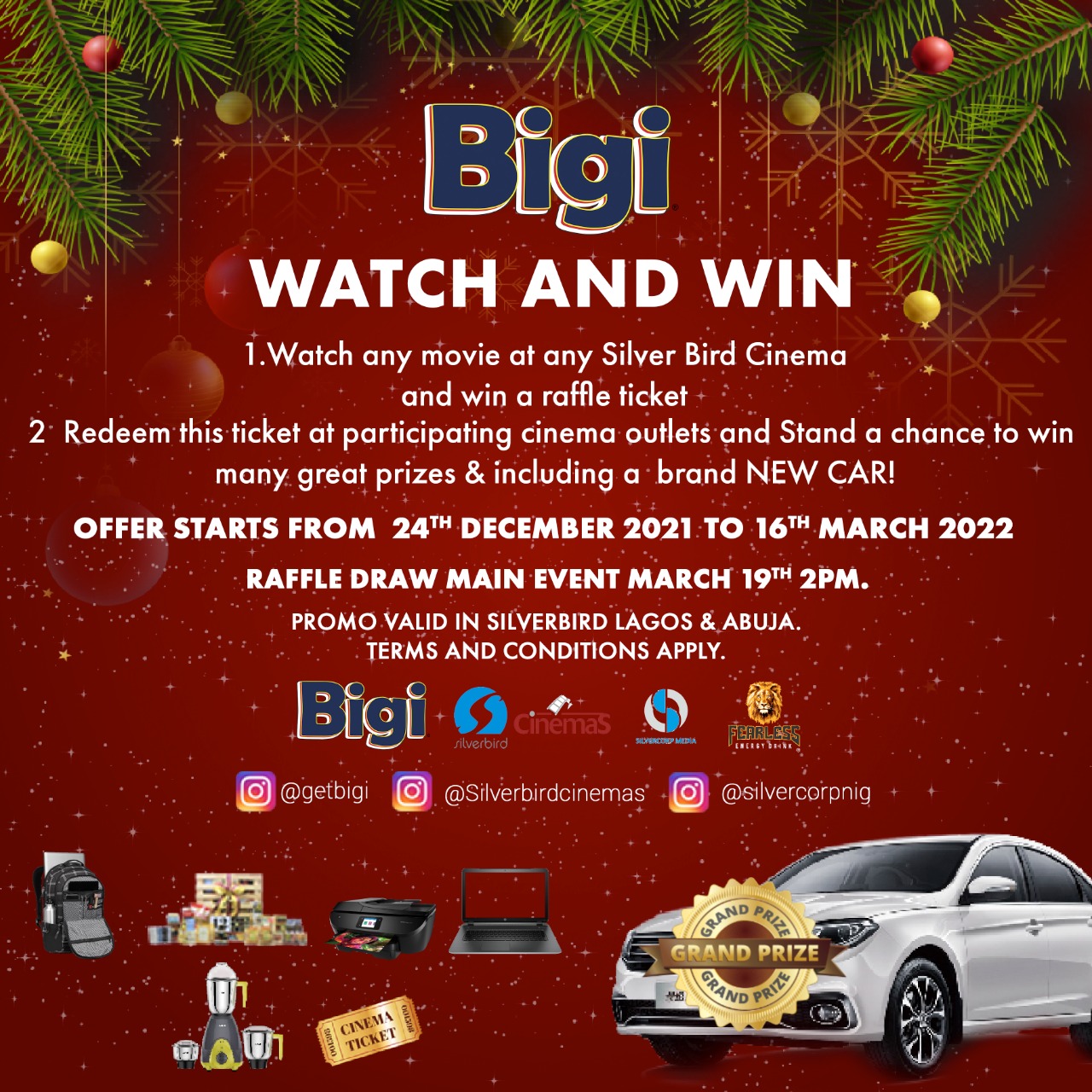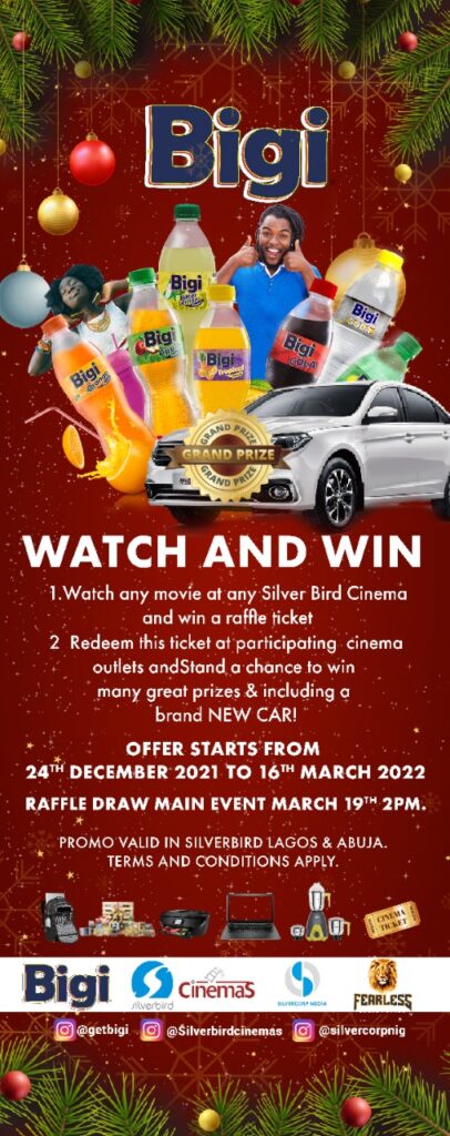 ‘Watch and Win’ is a promo flagged off by Bigi drinks to excite movie and cinema lovers in Lagos and Abuja. The offer commences on December 24, 2021.