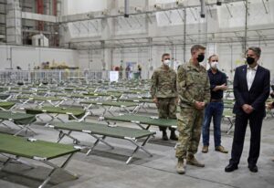 The top US diplomat flew out of Qatar, the largest transit hub in a massive airlift from Afghanistan, to tour another processing hub for thousands of evacuees at the US airbase in Ramstein, Germany.