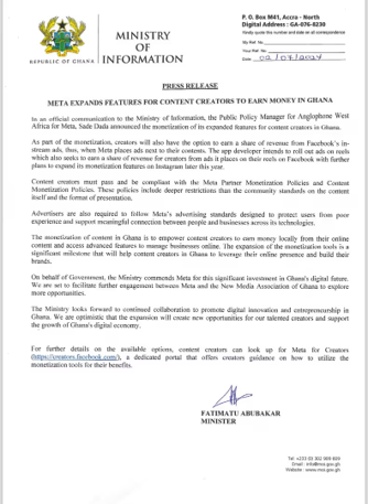 Additionally, the Ministry highlighted its commitment to facilitating collaborations between Meta and the New Media Association of Ghana to explore additional opportunities for content creators in the region.