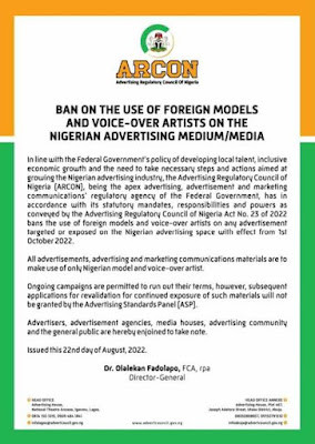 “ARCON, being the apex advertising, advertisement and marketing communications’ regulatory agency of the Federal Government, has in accordance with its statutory mandates, responsibilities and powers as conveyed by the Advertising Regulatory Council of Nigeria Act No. 23 of 2022 bans the use of foreign models and voice-over artists on any advertisement targeted of exposed on the Nigerian advertising space with effect from Ist October 2022,” Fadolapo said.