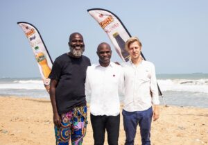 From Left: Akin Disu, Founder, Popbeach Club; with Seleem Adegunwa, Managing Director, Rite Foods Limited; and Alexander Ernst, Deputy Consul General, Federal Republic of Germany, Lagos; at the launch of Rite Foods Partner Popbeachclub’s social enterprise, “Riteonthebeach,” dedicated to the training of youths in various sphere of their respective endeavours and removal of social plastics from Lagos beaches for recycling, at Ilashe Beach, on Sunday, August 1, 2021