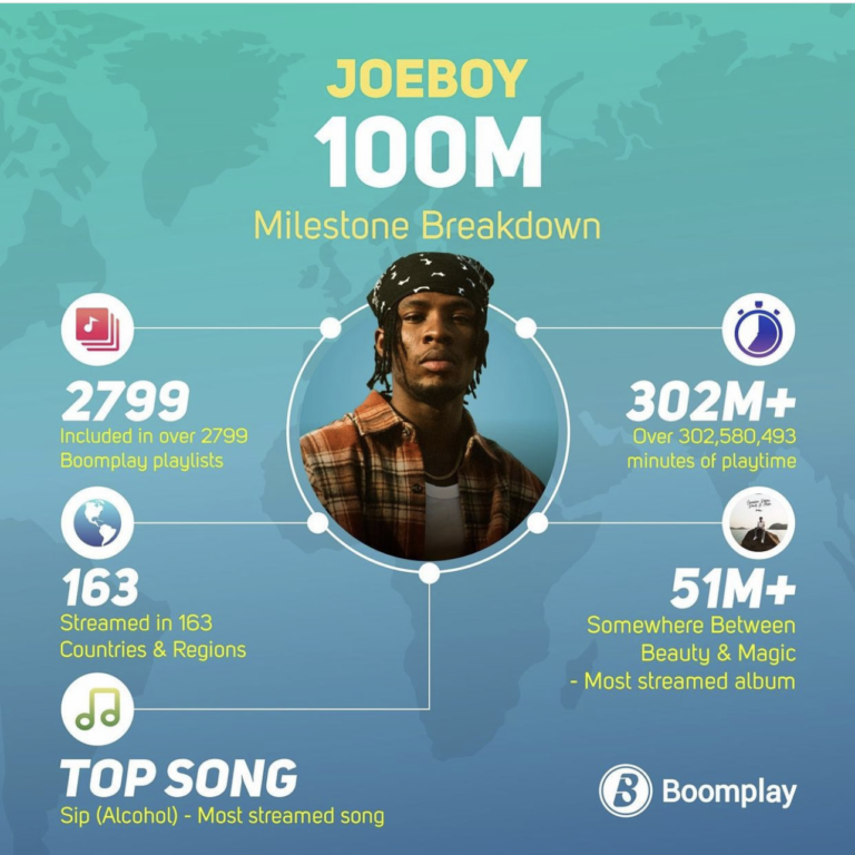 In January 2021, The Afropop sensation, Joeboy announced his debut album Somewhere Between Beauty & Magic, which was released in February, which would go on to be streamed over 60 million times while his most recent single Sip (Alcohol) became his most-streamed single with over 50 million streams as well as being the third most streamed song on Boomplay in 2021.