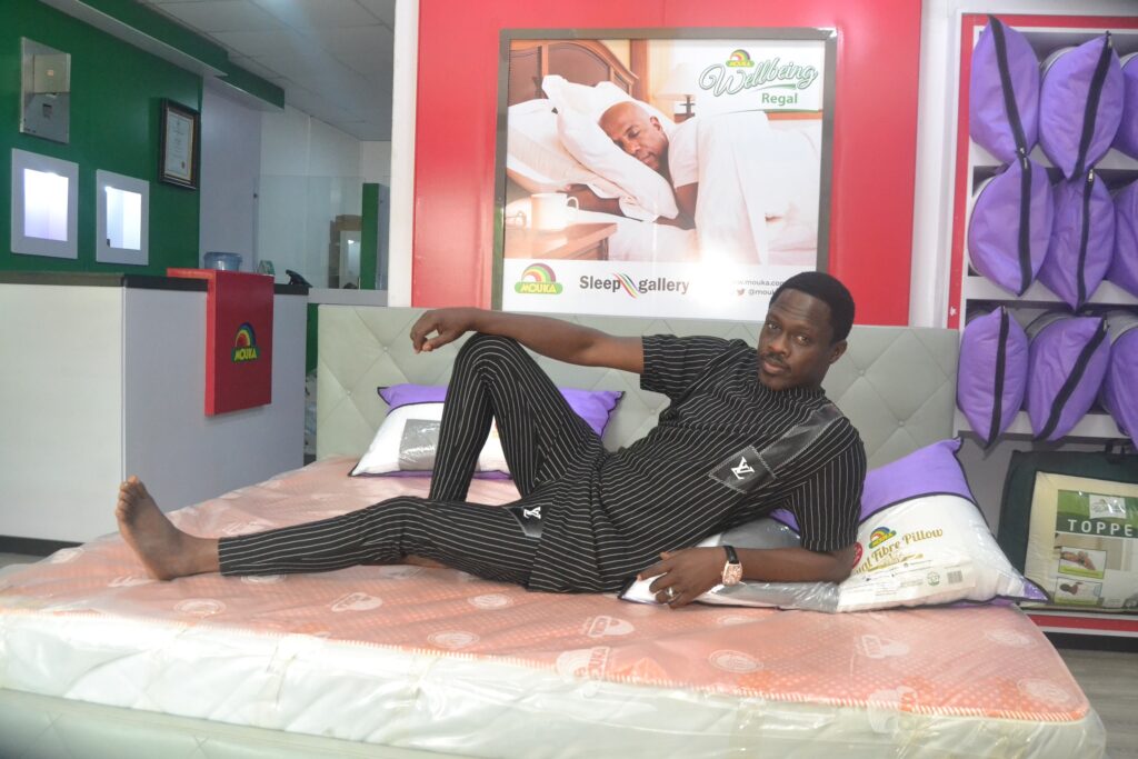 Celebrated Actor and Mouka’s Brand Ambassador, Ali Nuhu, laying on a Wellbeing Regal Orthopaedic Mattress at the company’s Sleep gallery, after his endorsement as a Brand’s Ambassador, at Mouka’s head office in Lagos, on Friday, 8 April, 2022.