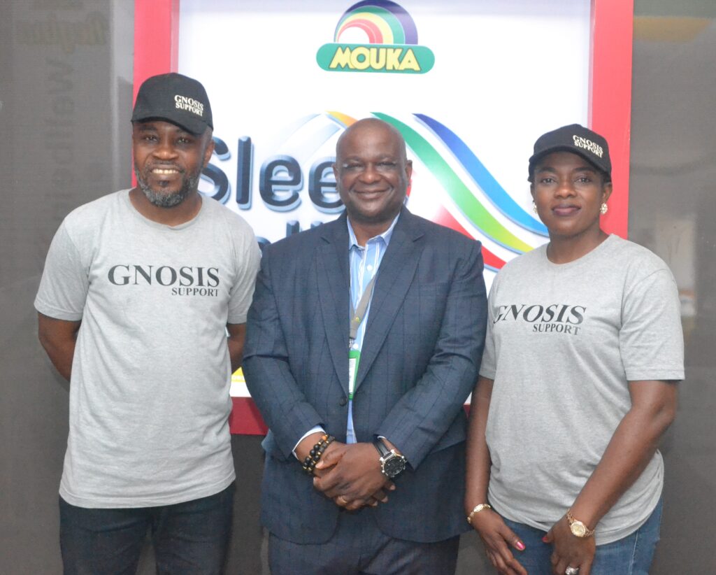From Left: Barrister Olumide Kayode-Omosebi, Founder, GNOSIS Help Initiative (GHI); with Mrs. Olaide Kayode-Omosebi, Co-Founder, GNOSIS Help Initiative (GHI); and Mr. Femi Yusuf, National Service Customer Manager, Mouka Limited; during the donation of mattresses to GHI, a non-governmental organisation (NGO) which takes care of displaced victims of domestic violence and abuse, at Mouka’s head office in Lagos, on Wednesday, 1 February, 2023.