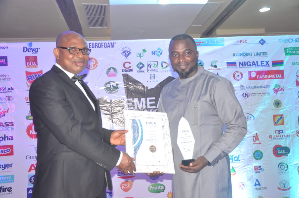 L-R: Amadi Iheukwumere, Chief Executive Officer, African Consolidated Analytical Limited presenting the Ecowas Mattress Manufacturing Company of the Year Award to Akeem Audu, Senior Brand and Innovation Manager, Mouka Limited, during the Ecowas Manufacturing Excellence Award held at Victoria Crown Palace Hotel, Victoria Island, Lagos, Nigeria.