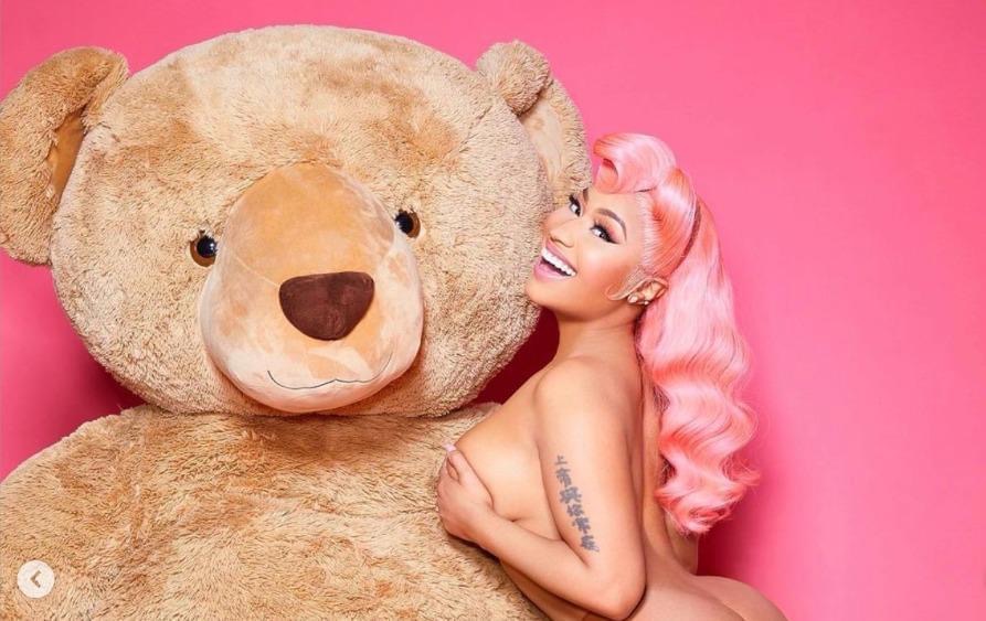 The second photo finds the Barbs queen straddling a large teddy bear while completely nude, rocking pink hair and platform heels as she smiles and looks back at the camera.