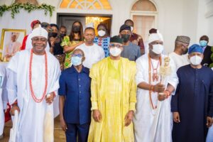 The Ooni of Ife, Oba Adeyeye Ogunwusi, President, Dangote Group, Aliko Dangote, former Governor of Edo State and former national chairman of the All Progressives Congress, Adams Oshiomhole, paid a condolences visit to the Ogun State Governor, Dapo Abiodun, to commiserate with him over the death of his father, Pa Emmanuel Abiodun.