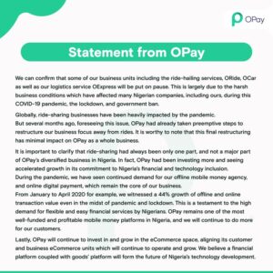 An official statement form the official twitter account of OPay revealed “this is largely due to the harsh business conditions which have affected many Nigerian companies during this COVID-19 pandemic, the lockdown and government ban.”