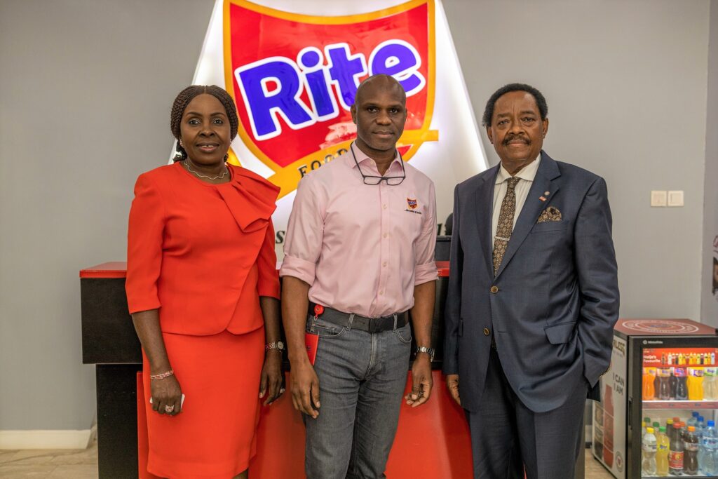 R-L: Photo shows Dr. Michael Olawale-Cole, President, Lagos Chamber of Commerce and Industry (LCCI); Seleem Adegunwa, Managing Director, Rite Foods Limited and Dr. Chinyere Almona, Director-General, Lagos Chamber of Commerce and Industry (LCCI) during the courtesy visit by LCCI to Rite Foods Limited, leading manufacturers of carbonated soft drinks, energy drinks, premium table water and sausages at the company’s corporate headquarters in Opebi, Lagos.