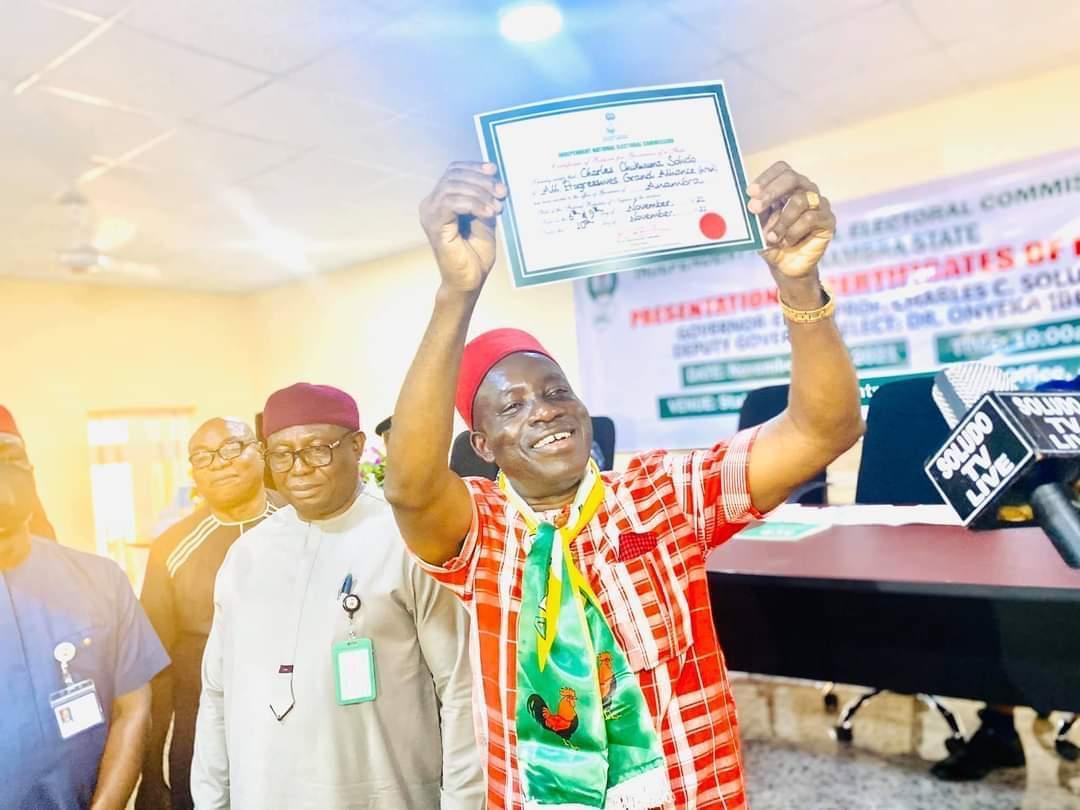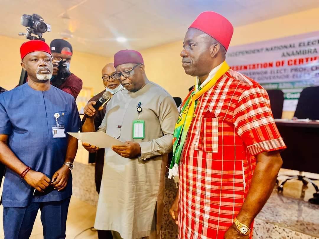 Anambra governor-elect, Prof. Charles Soludo has received his certificate of return from the Independent National Electoral Commission (INEC).