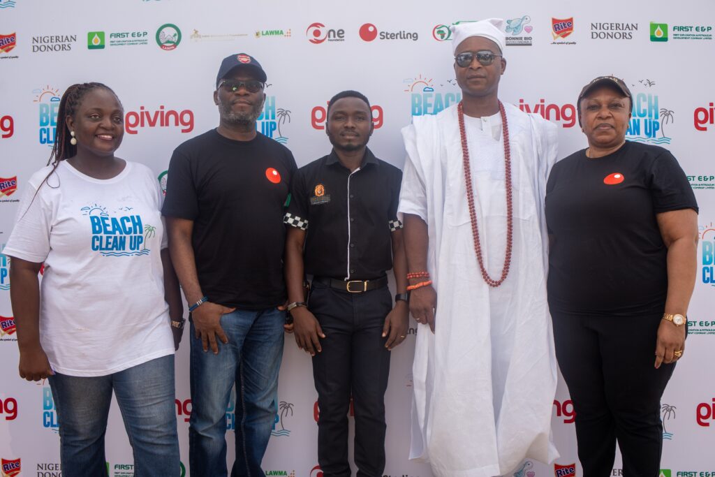 Olapeju Ibekwe, Chief Executive Officer, Sterling One Foundation, Tunde Adeola, Executive Director, Commercial and Institutional Banking, Sterling Bank, Olawale Odenusi, Representing Rite Foods Limited, Chief Olumide Oniru, Olopon of Iru-land and Mrs. Mojisola Bakare, General Manager, Corporate and Investment Banking, Sterling Bank, during the Oniru Beach Clean Up on World Recycling Day 2022, sponsored by Rite Foods Limited in Lagos.