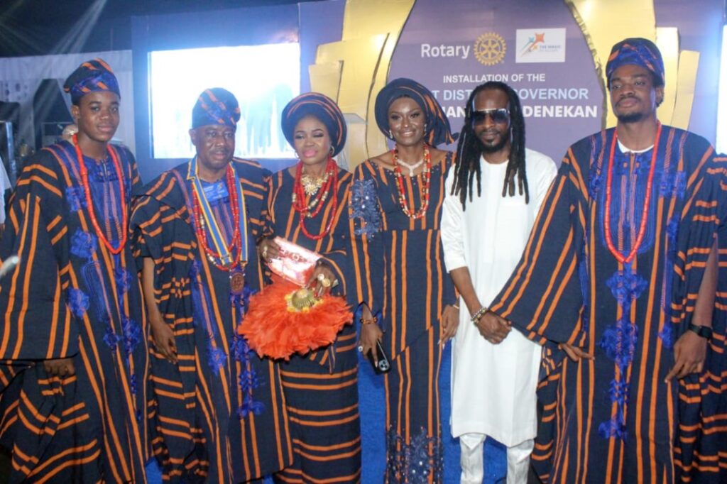 Rotary International District 9112 Governor, Rotarian Femi Adenekan (second left), his wife, Rotarian Tayo, their children with 9ce (second right) award-winning musician and songwriter, 9ice (real name: Abolore Adegbola Akande) during Adenekan’s installation at the weekend in Lagos