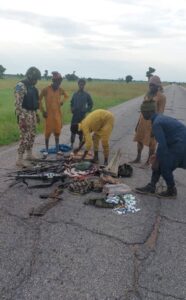 “The fire arms and incendiaries recovered from the terrorists include, 8 AK 47 rifles, 1General Purpose Machine Gun (GPMG), 2 Fabrique Nationale (FN) Rifles, 1 Dane Gun, 1Makarov Pistol, 89 rounds of 7.62mm (Special) ammunition, 89 rounds of 12.7mm ammunition, 66 rounds of 7.62mm (NATO) ammunition, 5 x 9mm rounds of ammunition, 2 Hand Grenades, 27 AK 47 Rifle magazines and 2 FN Rifle magazines.