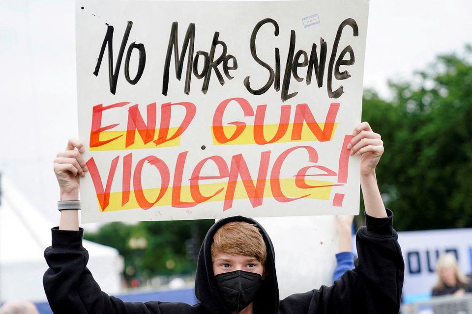 A demonstrator holds a placard while taking part in the ‘March for Our Lives’, one of a series of nationwide protests against gun violence, in Washington, D.C., U.S., June 11, 2022. REUTERS/Joshua Roberts/File Photo