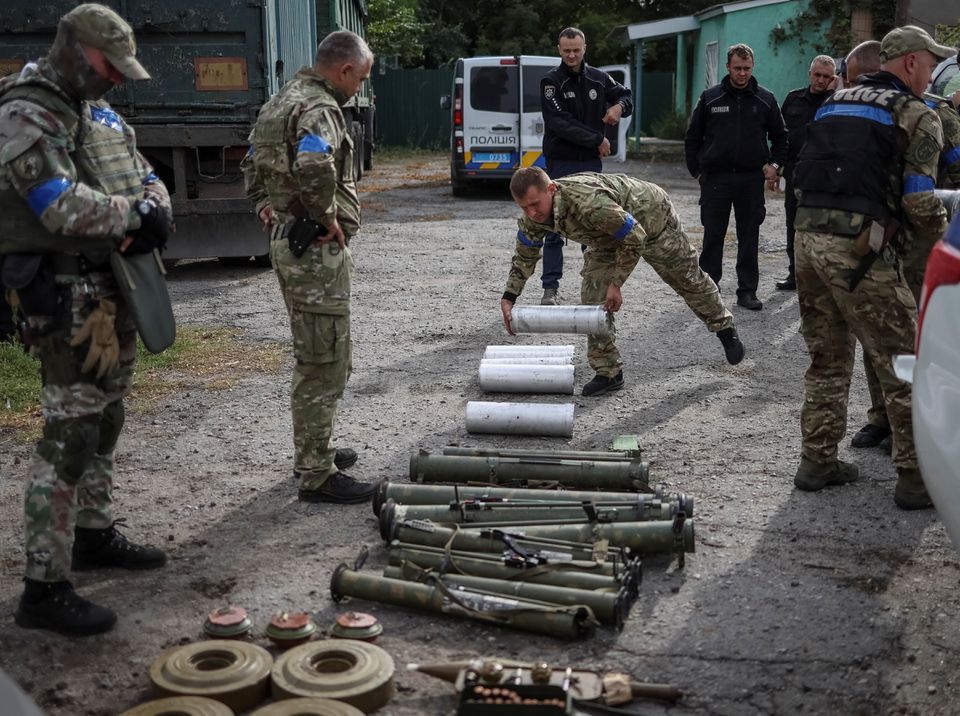 A police sapper carries a cassette with anti-personnel mines POM-3 after return from the village of Udy, recently liberated by Ukrainian Armed Forces, in the town of Zolochiv, Kharkiv region, Ukraine September 12, 2022. REUTERS/Gleb Garanich