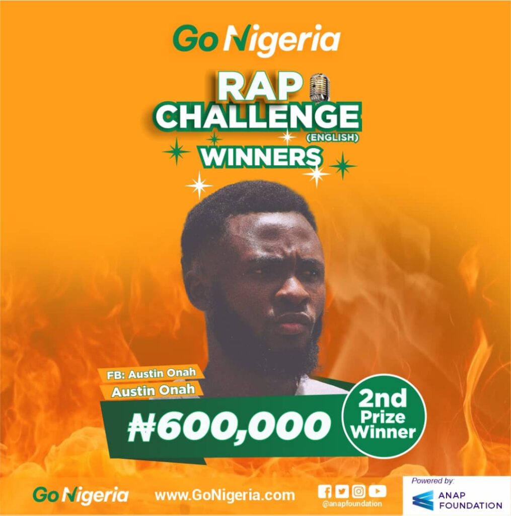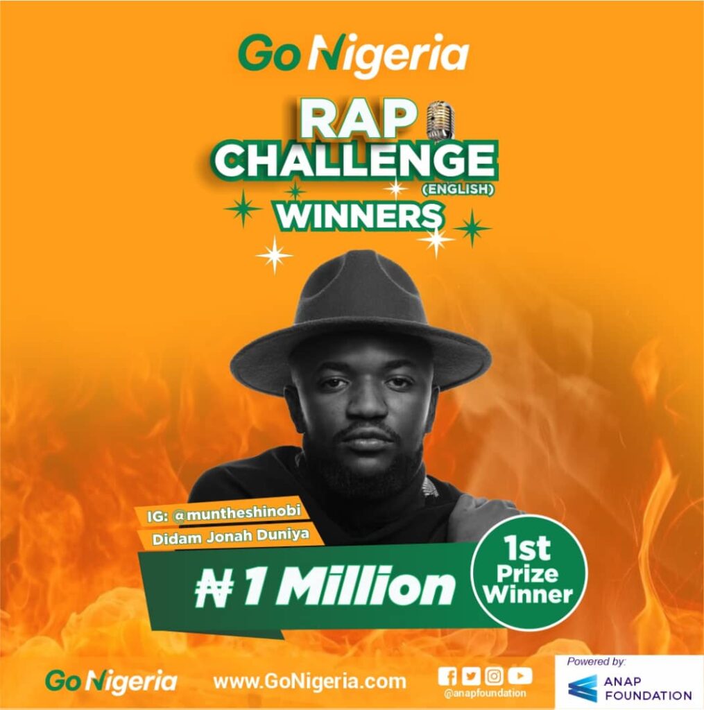 The GoNigeria Initiative, which encourages youth participation in the electoral process, has announced the names of young Nigerians who won the top 3 prizes in the GoNigeria English Rap Challenge. The winners are Didam Jonah Duniya from Kaduna State who emerged as the Star prize winner of the competition with a cash prize of N1,000,000 (One Million Naira), as well as Austin Onah from Benue State and, Foster Chima from Imo State who emerged as the first and second runners-up with cash prizes of N600,000 and N400,000 respectively. The English Rap Challenge was organized to further boost the public enlightenment campaign of  GoNigeria, an advocacy initiated by Anap Foundation which seeks to sensitize Nigerian youths to register to vote, obtain their PVCs and participate in the electoral processes during the 2023 General Elections.